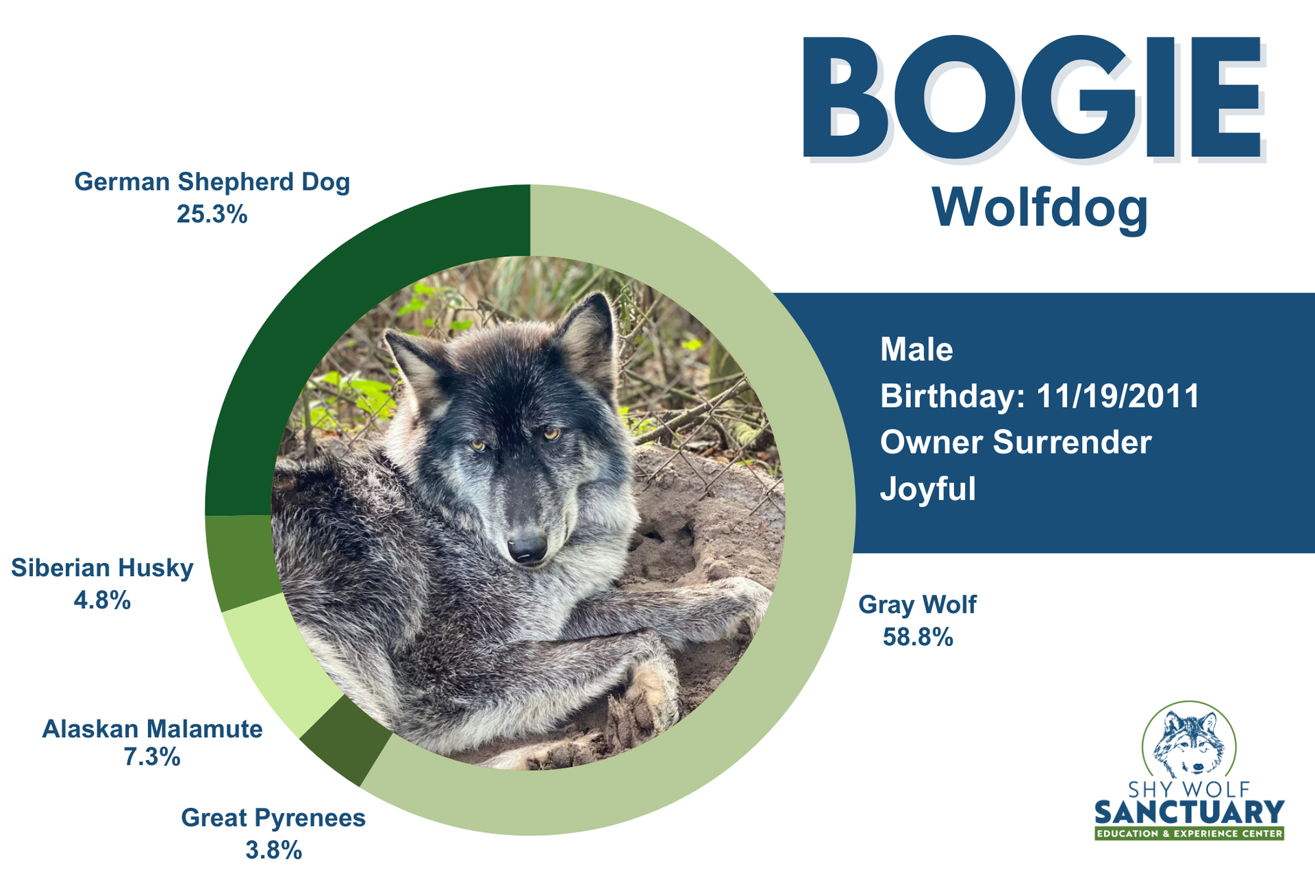 Bogie is a star, in more ways than one, so naming him after famous movie star Humphrey Bogart, seemed only appropriate. His past is a mystery, but he wandered into the yard of a Miami man in November of 2017. Because he wanted company of the man’s dogs, Bogie hung out for a week with nothing keeping him there. The gate was wide open but yet he stayed. They were able to recognize him as a wolfdog and put video online trying to find his owners. With more than 30,000 views, no one came forward. Rescue was contacted and Shy Wolf Sanctuary heard about his situation. Our founder and staff jumped in the van the very next day, extremely concerned about the foot he was favoring for more than a week. Leaving very early in the morning, they found their way to the Miami location.