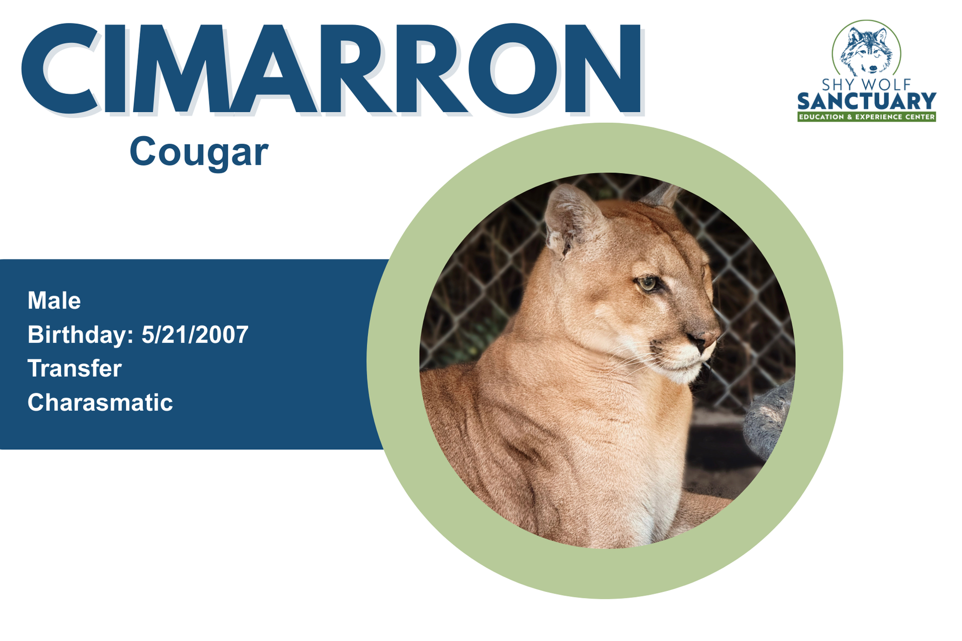 They also come only in the tan color you see exhibited by Cimarron. There is no “Black Panther” as any black cat would be either a leopard or a jaguar. Born in captivity, Cimarron’s life started out with a lot of attention. He was played with roughly and as he grew their method of control at the facility was to hit him over the head with a lead pipe.