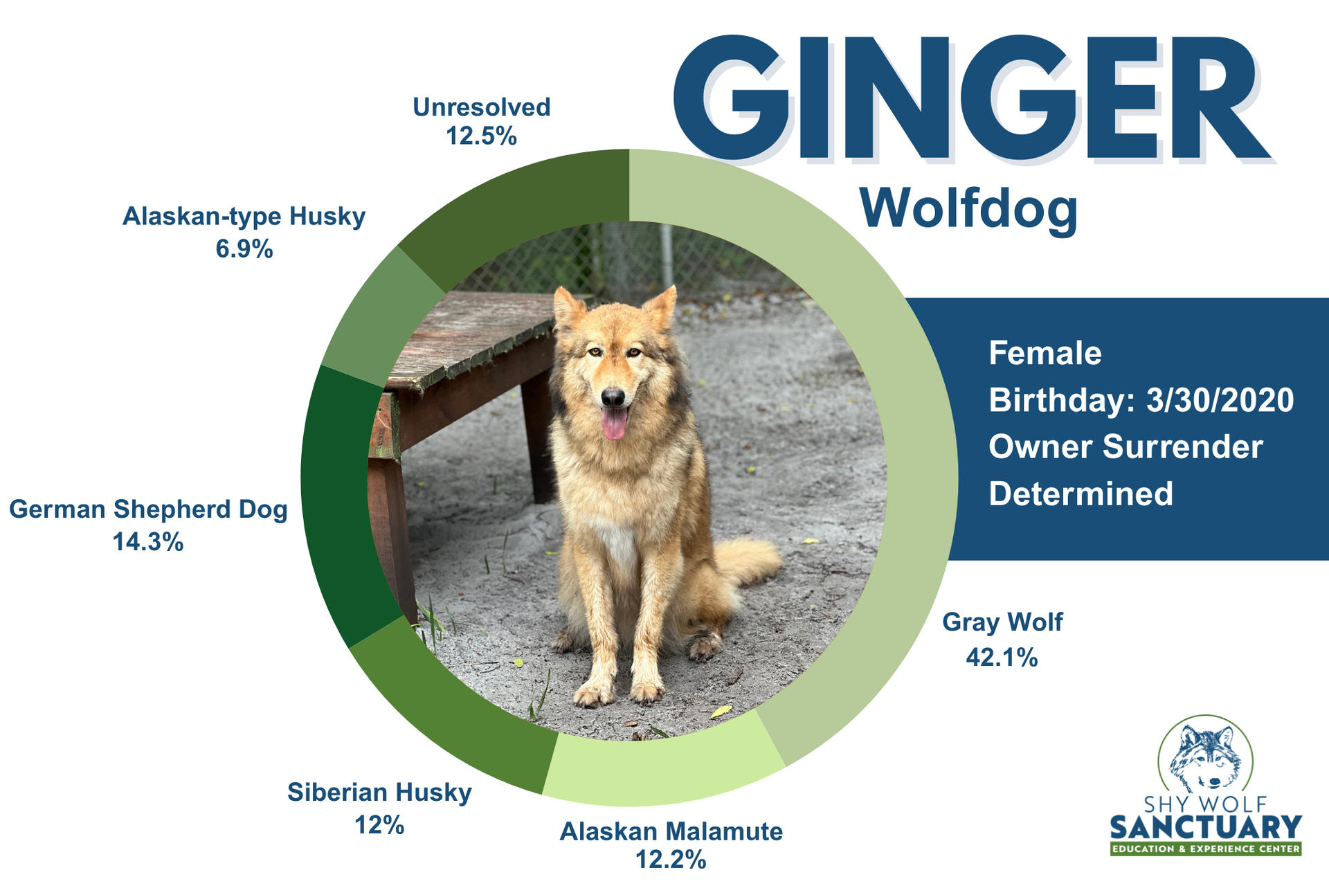 Ginger is a wolfdog that came to us at about four to five months old, in late August of 2020. She was living in a home with someone that had multiple pets, from cats to other dogs, to reptiles. The person had made an appointment to get Ginger spayed, and upon check in at the clinic, the owner stated that Ginger had also been vomiting and was sensitive to the touch on her belly. Radiographs were taken and showed a dog toy in Ginger’s stomach - her spay surgery turned into an emergency foreign body surgery. The surgery was a success, and it was decided that Ginger was too much for her previous owner to handle, so she became a sanctuary resident.