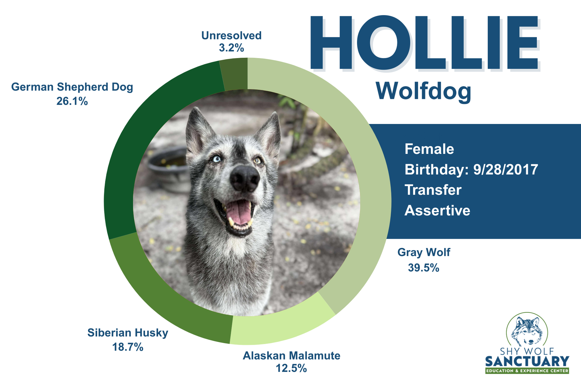 Hallow arrived on 09/27/19 but has since been renamed Hollie by our Founder, after a volunteer who passed. This sweet girl came from our friend Jessika known on social media as @JuniperFoxx. Jessika rescued her from a Kentucky shelter and had a special bond with this girl. Once Hallow got comfortable in her new setting she started to show aggressive behavior towards other dogs. This is a fairly common trait in dogs with high prey drives like the Northern breed mixes. It would take a special owner and situation to keep Hallow as a companion animal and make sure that she and all other animals are safe. Because we’ve been rescuing, providing sanctuary and adopting out wolfdogs for so long, Jessika knew Shy Wolf was the right place to bring Hallow.