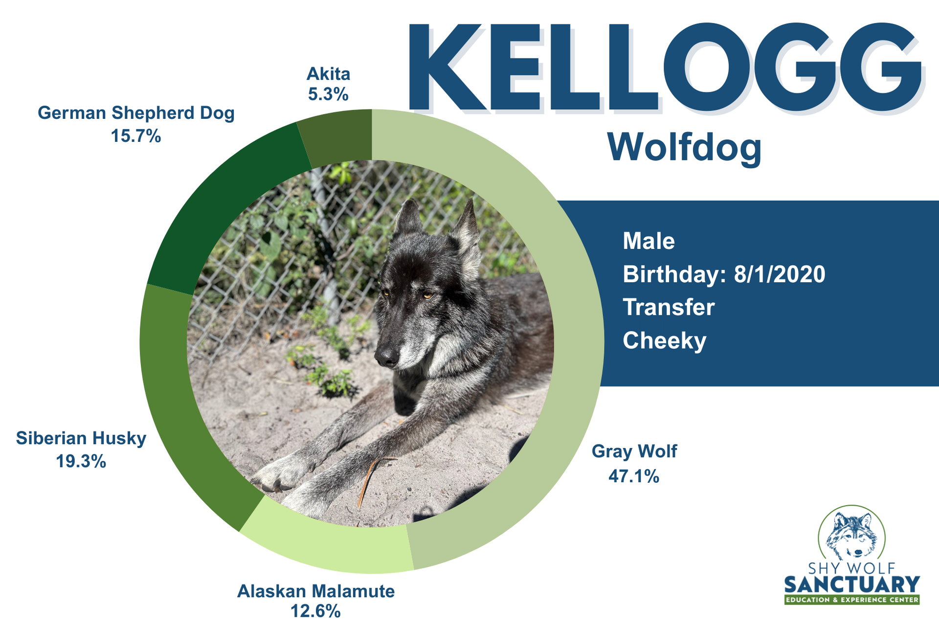 Kellogg is a wolfdog that was rescued with his sister Scout, by Shy Wolf Sanctuary from a shelter in September of 2022. The shelter had stated that the male was more nervous than the female, but neither animals showed any signs of aggression. They were surrendered to the shelter as indoor/outdoor dogs. During the evaluation process, the shelter noted that these two wolfdogs needed proper containment, such as an enclosure with lean ins and anti dig, and they had a high prey drive for small dogs and chickens. We stepped in to take the siblings with hope that they would adjust to sanctuary life.