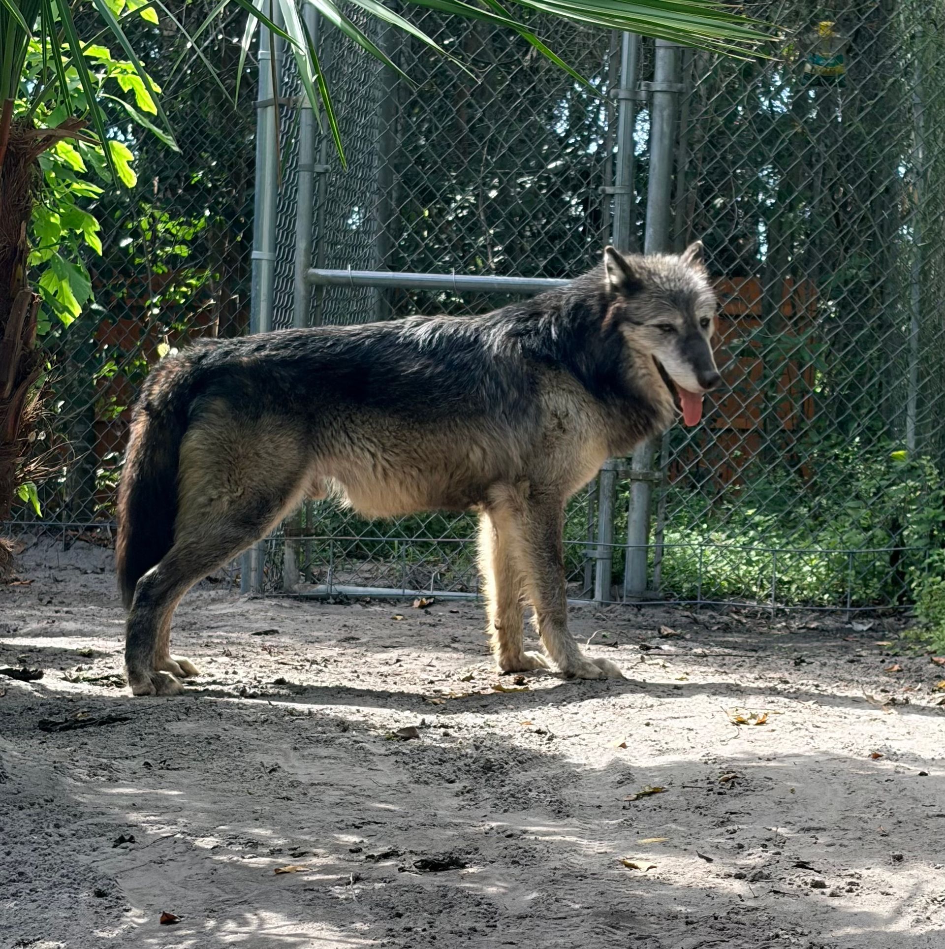 Legion is a striking black male wolf with a strong presence and a calm, steady demeanor. His dark coat and confident posture make him truly unforgettable. Legion also came to Shy Wolf Sanctuary after the sudden closure of Seacrest Wolf Preserve, when the loss of their property created an urgent need to relocate the animals in their care.
