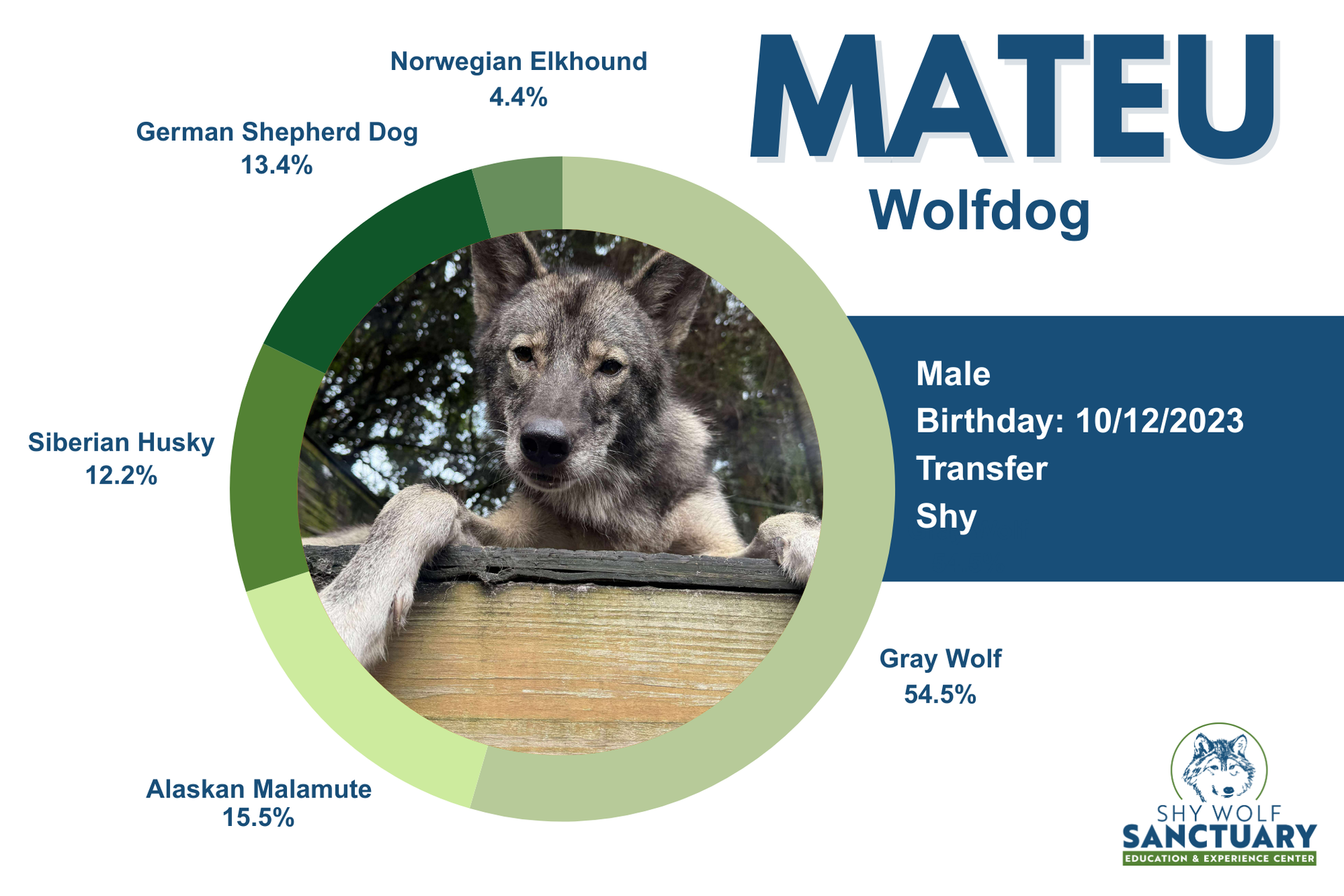 Mateu came to us from Tennessee in October of 2024. He was confiscated from a hoarding situation with 11 other wolfdogs, all different sizes and ages. He is only 1-2 years old, and when the shelter reached out to us, we hoped he would be the perfect companion to four year old wolfdog, Ginger. Two of our volunteers graciously offered to adjust their road trip to transport Mateu from Tennessee to Florida. Mateu came to us underweight and with worms, but over all he was healthy. For about a month, our animal care staff worked diligently – feeding him every day twice a day, to help him put weight on before meeting his new possible friend. For three weeks, our animal care team conducted introductions between Ginger and Mateu, closely monitoring their behaviors. With three weeks of positive body language between the two animals, our animal care team let Mateu finally run with Ginger in her enclosure! We are hoping that this is a perfect match. Welcome home, Mateu!