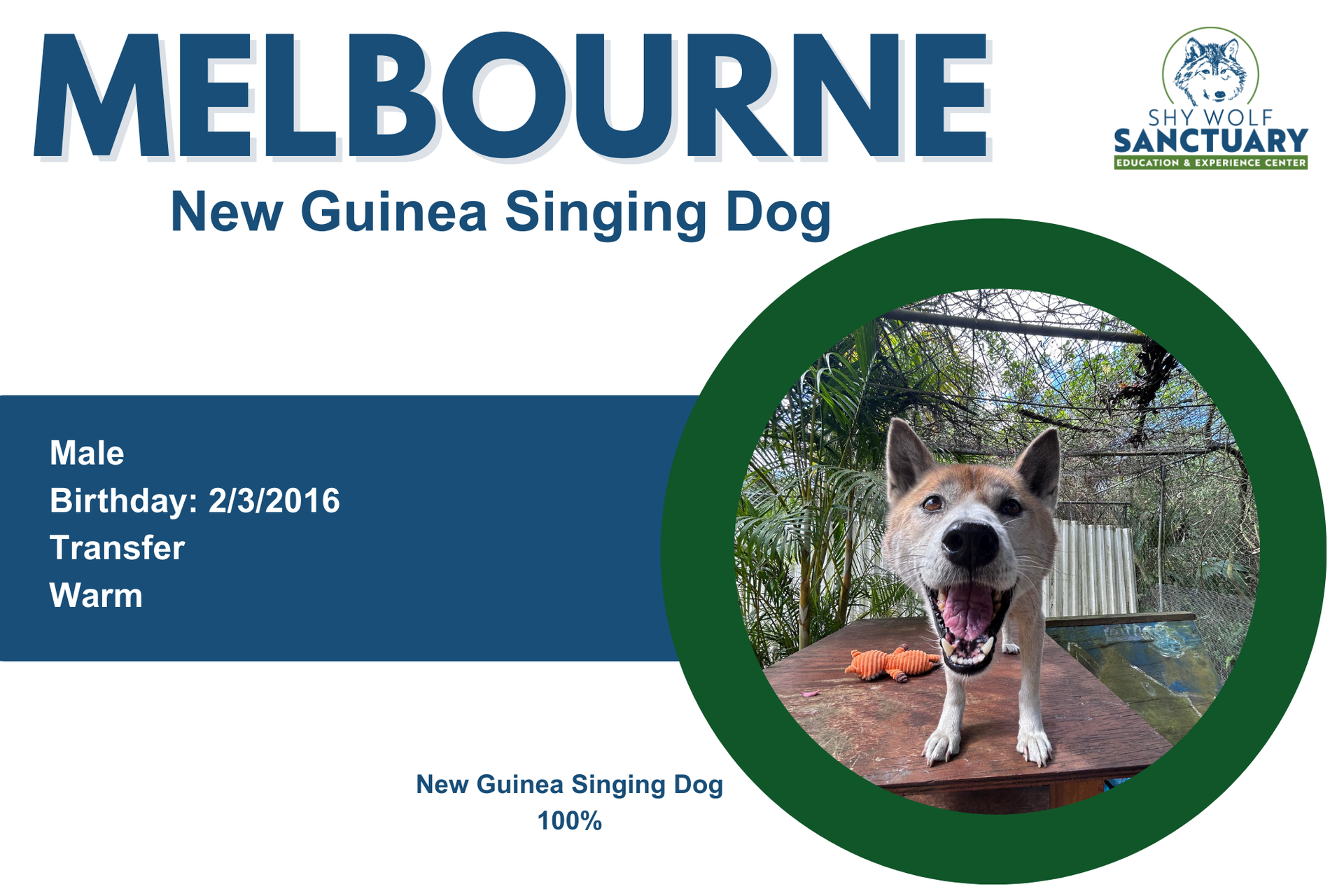 Melbourne was in a foster home in Florida when we were contacted about taking him in to Shy Wolf in February of 2018. He was estimated to be two years old and originally came from a petting zoo. The man who owned him put the pair into an exotic animal auction where he was purchased by several members of the New Guinea Singing Dog Conservation organization. They wanted Melbourne and his female companion to be safe and not end up in a back yard breeder situation.