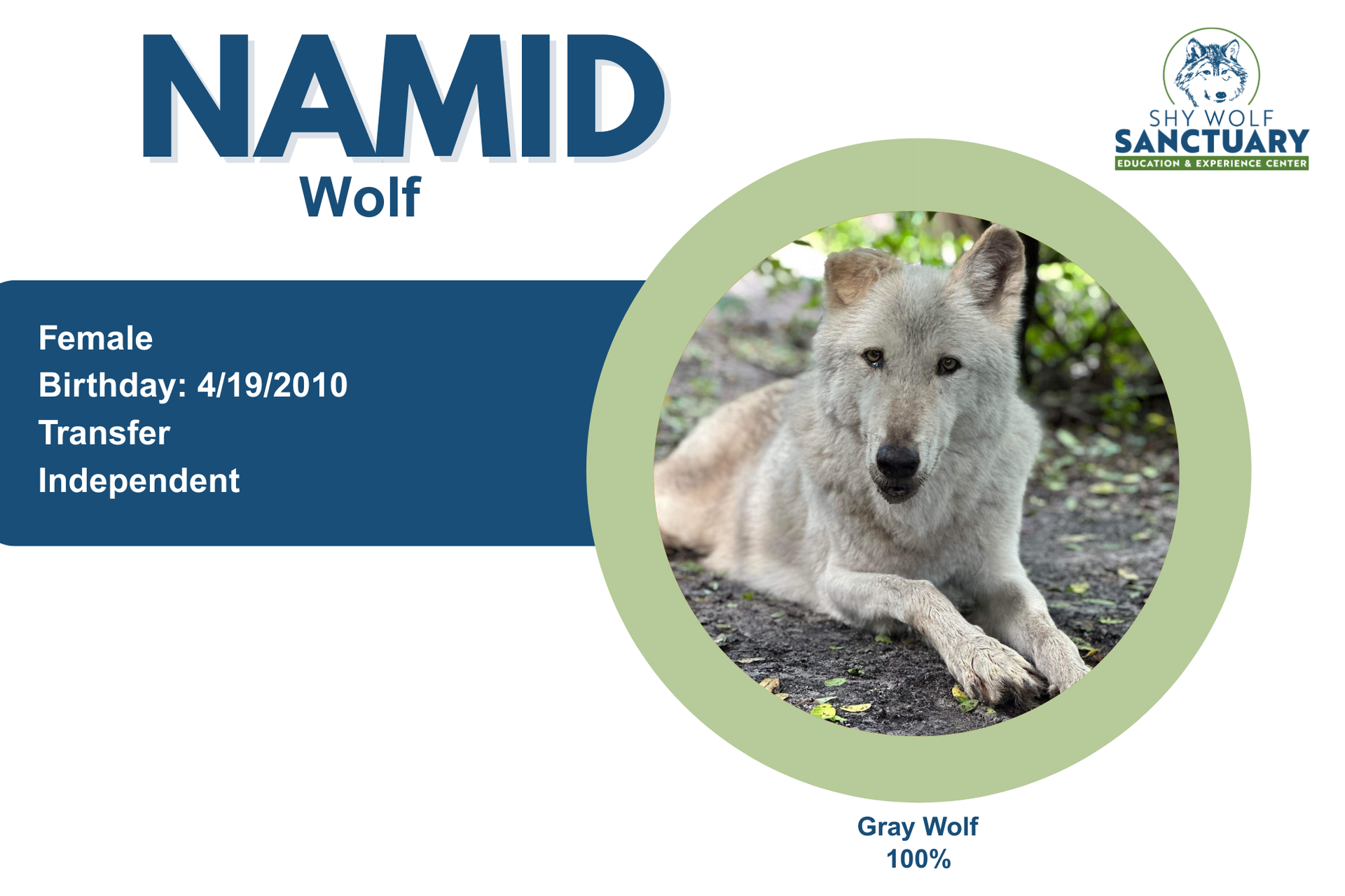 It is at this time we are starting to see different personalities emerge. They are taking on some of the characteristic of their adoptive “parents”. They have all become a bit cautious, a typical wolf trait, but Namid has grown into a dominant female that doesn’t get along with other females. Until February 2017, she resided with Coosa, an older male wolfdog, who knew how to handle her and stood up to her when necessary. A short while later, Lakota lost his mate Julie, and we were thrilled Namid and Lakota immediately loved each other. Namid remains loving to those select few volunteers she chooses, but has shown a willingness to challenge volunteers even when they are trying to take her for a walk. Namid is one of those animals that needs to be understood and respected for who she has become.