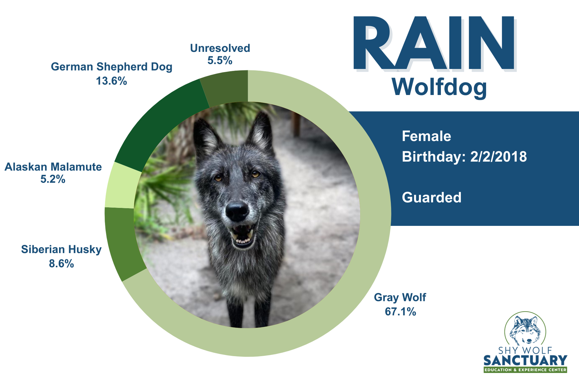 Rain was initially named Rakshaw and lived at a backyard zoo as an ambassador. Shy Wolf Sanctuary was contacted about re-homing her. Before we could get information, she was given to one of the handlers who, being 8 months pregnant, gave her to some friends.