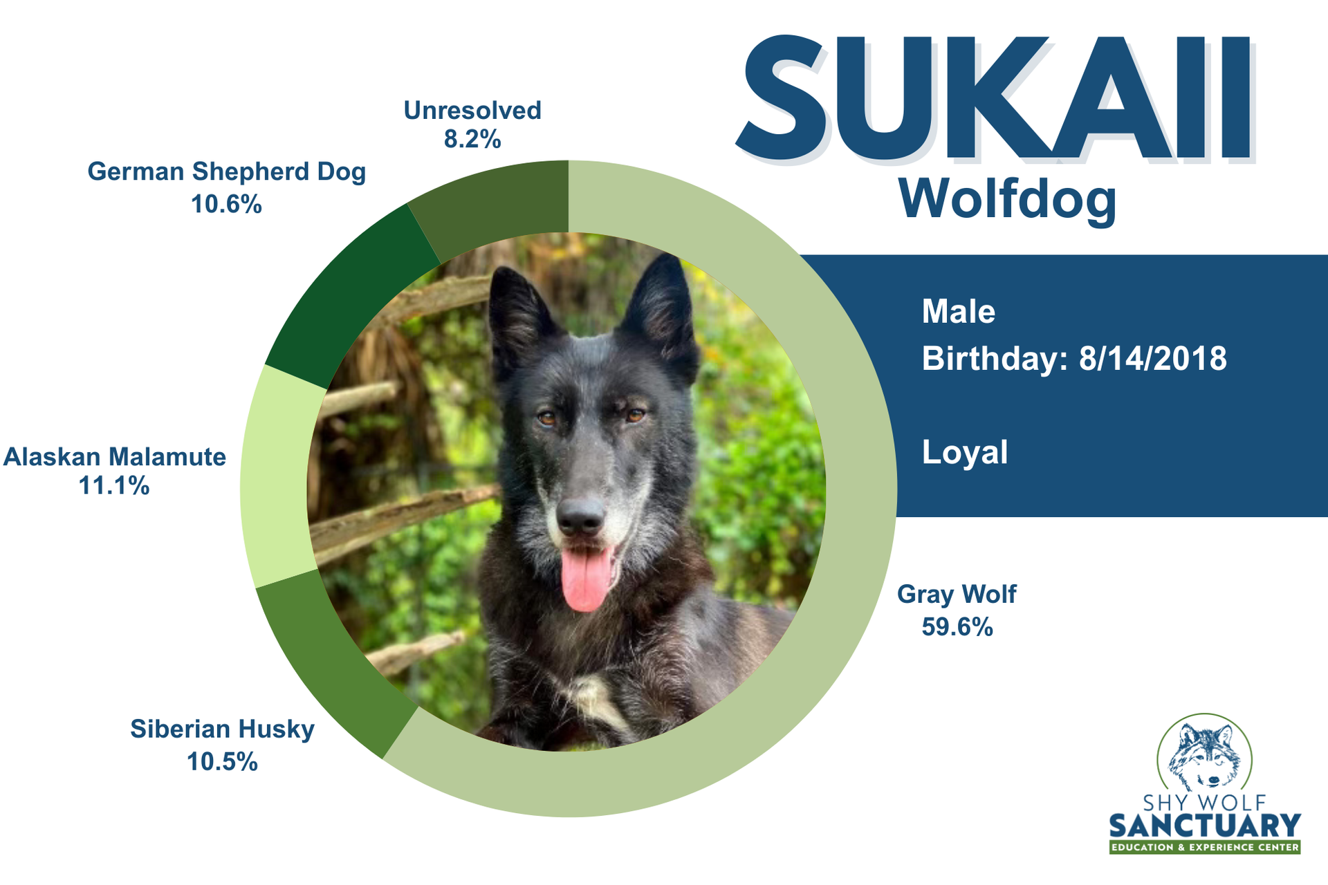 When rescued, Sukaii was slightly underweight with matted hair and burrs. Based on his behavior, volunteers believe that he was socialized with humans. Sukaii may have been abandoned because he is a climber and has wolf personality traits.
