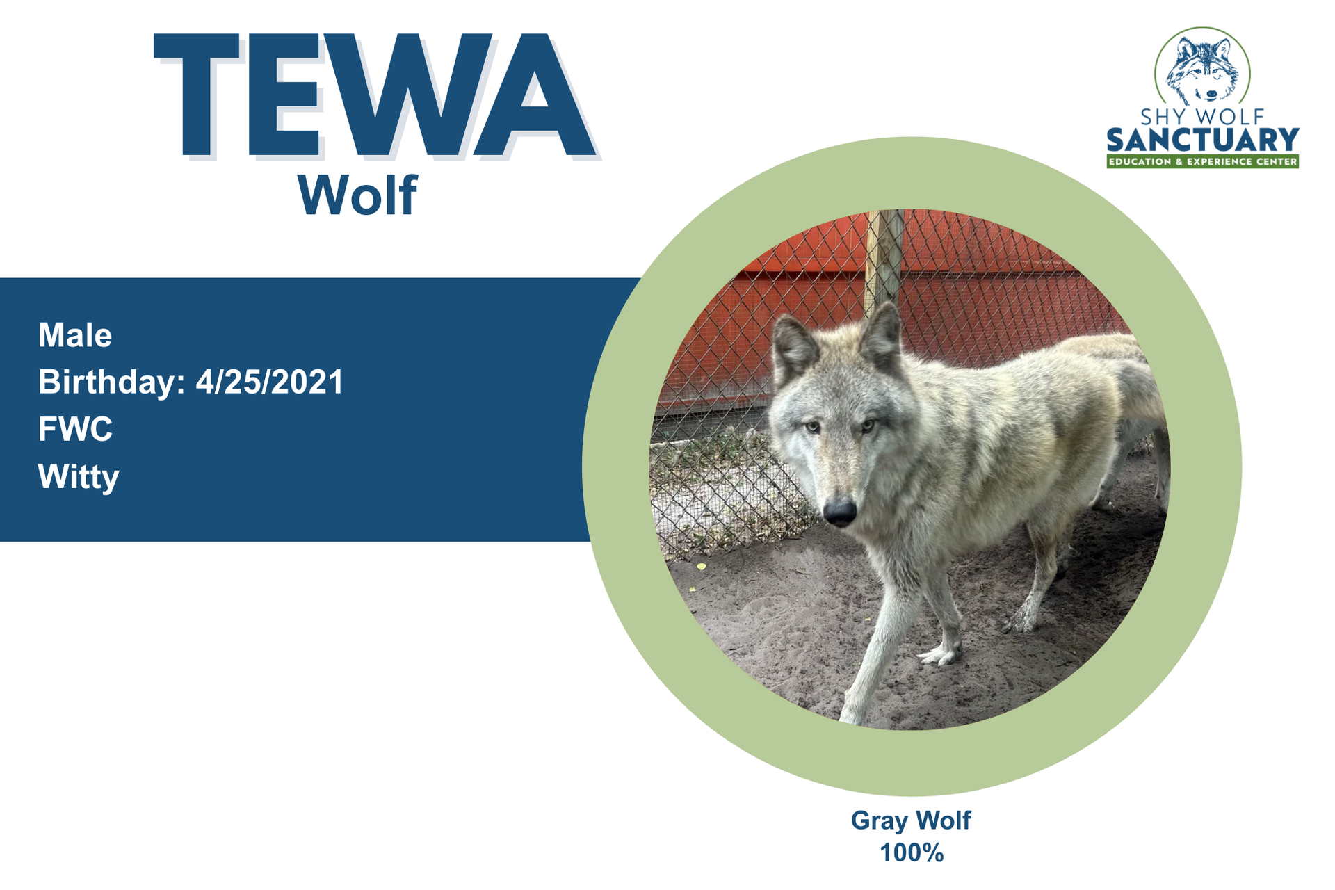 Tewa is the name our Founder chose for the new arrival, meaning a member of the Pueblo people of the Rio Grande, only three months old and 12 pounds. He was about 20 pounds underweight for a wolf pup and the DNA shows he is as high as Embark will provide on their testing at 95+% grey wolf. Florida regulates the ownership and containment of wolves and requires import permits, when done legally, for any animal brought into the state. Tewa’s breeder thought they were selling to people that lived in their home state, but that was not the case. Tewa ended up being owned by a young couple with other large dogs, and living in an apartment in Florida.